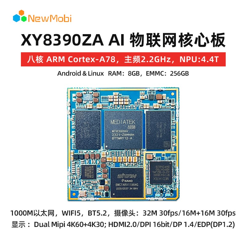CPU:MT8390( Genio 700) GPU:Mali-G57 MC3 NPU:4.4TOPs 架構(gòu):2xA78 2.2Ghz + 6xA55 2.0Ghz 內(nèi)存:4GB+64G/6G+128G/8G+256G 操作系統(tǒng):Android & Linux 網(wǎng)絡(luò)支持:1000M以太網(wǎng) 無(wú)線連接:Wifi5